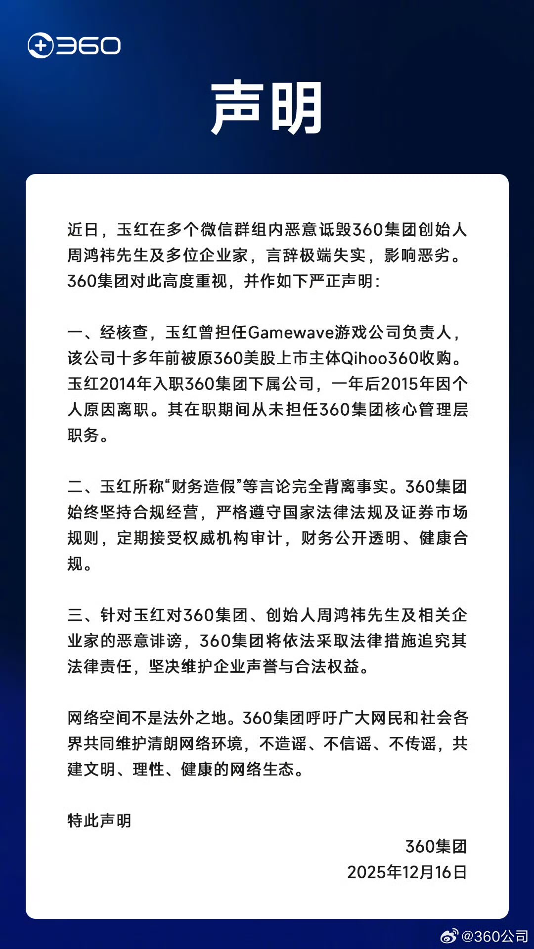 声明还称,针对玉红对360集团,创始人周鸿祎先生及相关企业家的恶意诽谤,360集团将依法采取法律措施追究其法律责任,坚决维护企业声誉与合法权益。网络空间不是法外之地。360集团呼吁广大网民和社会各界共同维护清朗网络环境,不造谣,不信谣,不传谣,共建文明,理性,健康的网络生态。